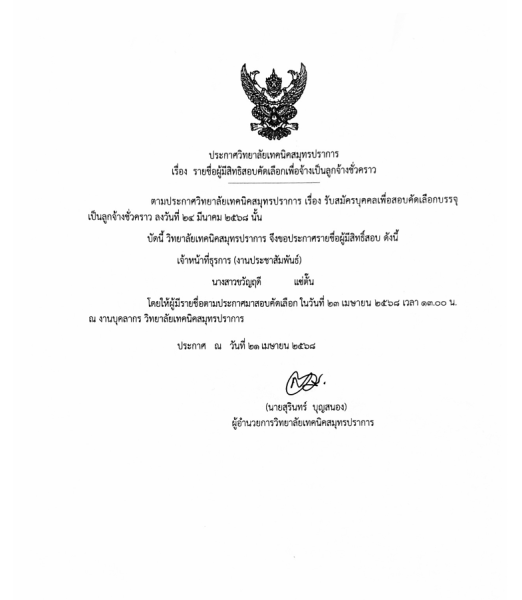 ประกาศรายชื่อผู้มีสิทธิสอบคัดเลือกเพื่อจ้างเป็นลูกจ้างชั่วคราว (เจ้าหน้าที่ธุรการ งานประชาสัมพันธ์)