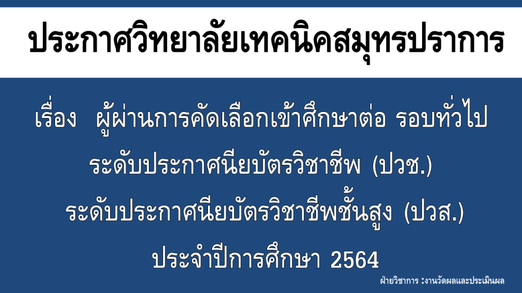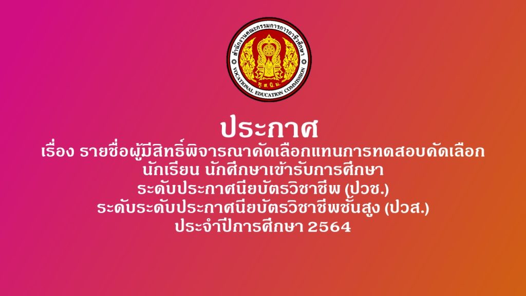 ประกาศ รายชื่อผู้ผ่านการคัดเลือกเข้าศึกษาต่อ รอบทั่วไประดับประกาศนียบัตรวิชาชีพ (ปวช.) ระดับประกาศนียบัตรวิชาชีพชั้นสูง (ปวส.) ประจำปีการศึกษา 2564
